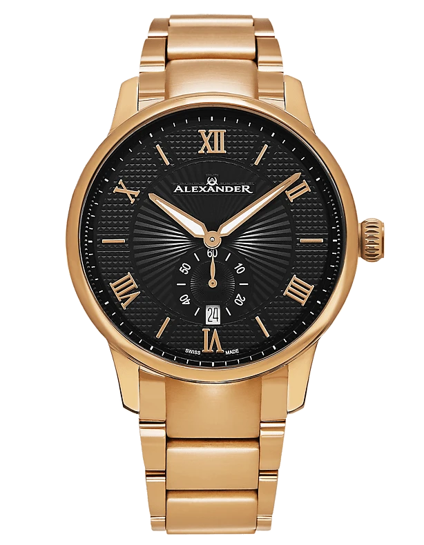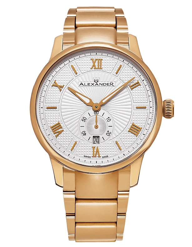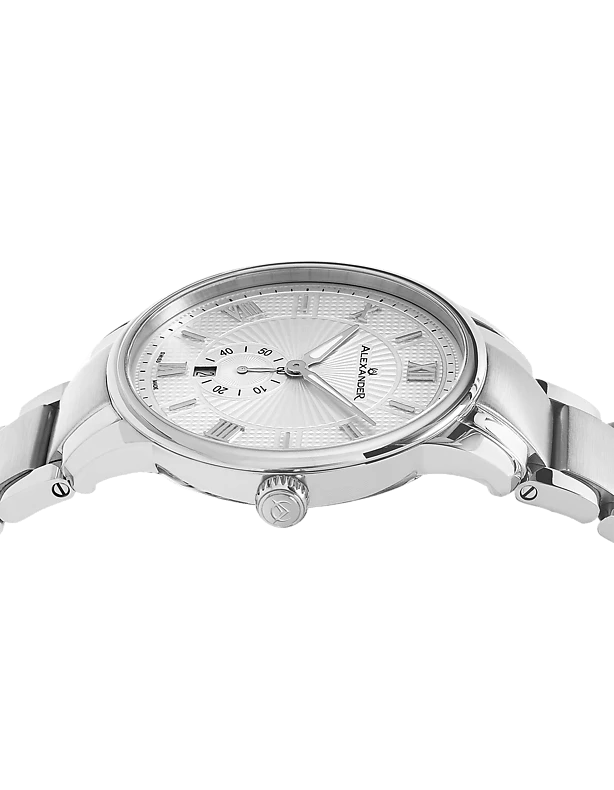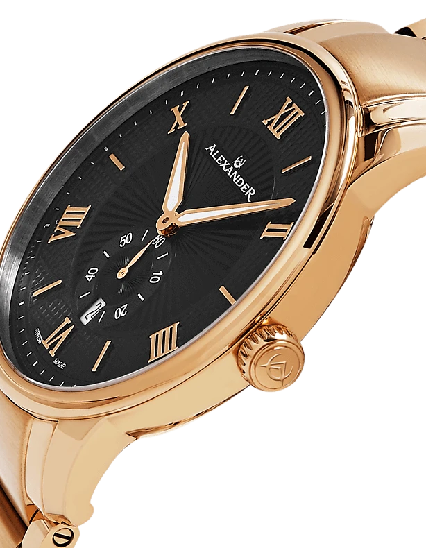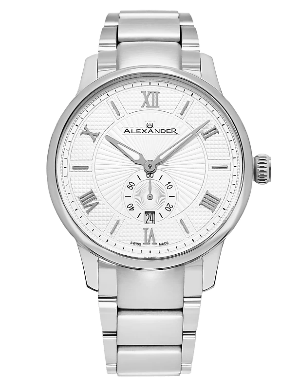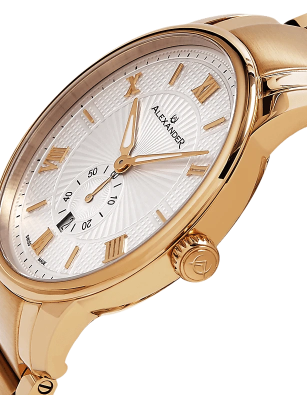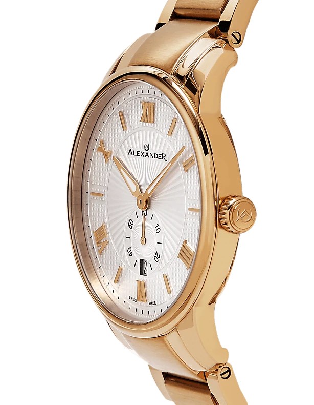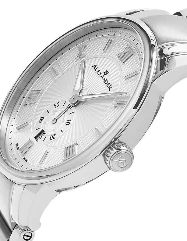 The Swiss Made Regalia A102B combines classic elegance with precise craftsmanship. Featuring a 42mm 316L surgical grade stainless steel case, this timepiece is powered by the reliable Ronda 6004.D Swiss Quartz movement. The dial, adorned with applied baton indexes and Roman numerals at the 2s, is complemented by alpha hands with luminous infill for readability in any light. With a case thickness of just 9mm, the Regalia A102B maintains a sleek and refined profile. The watch includes a day of month display, adding functionality to its sophisticated design. The scratch-resistant sapphire crystal and stainless steel 3-segment link bracelet ensure durability and style. Water-resistant up to 3 ATM, this watch is perfect for both everyday wear and special occasions.