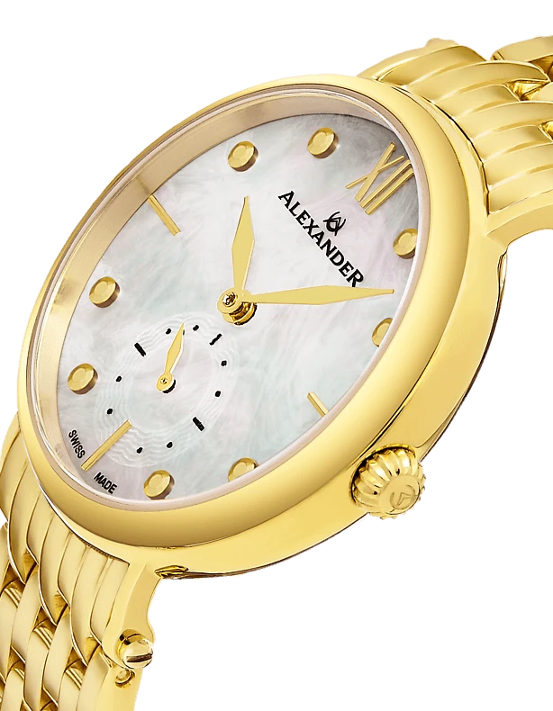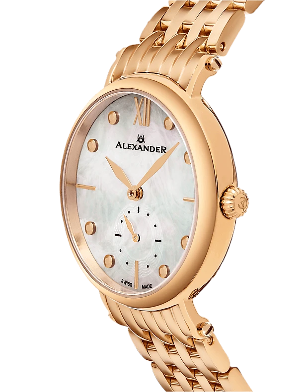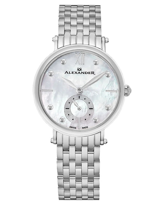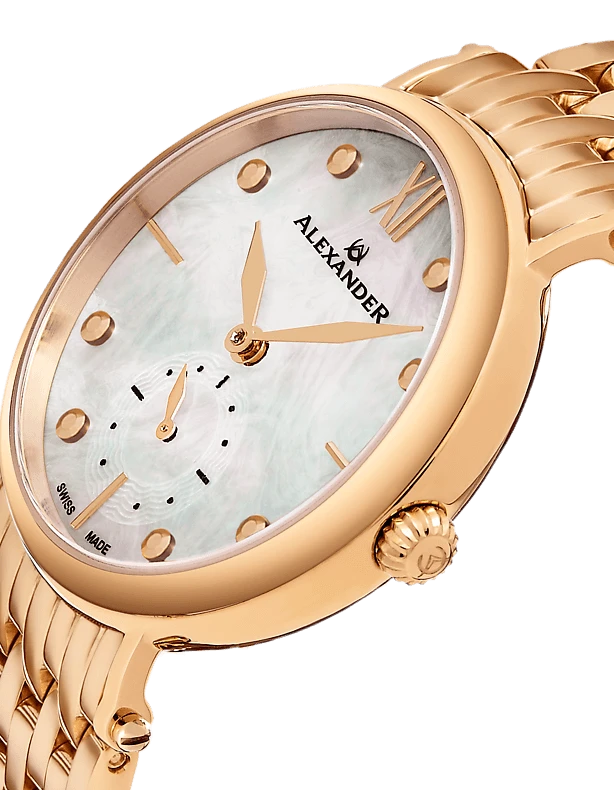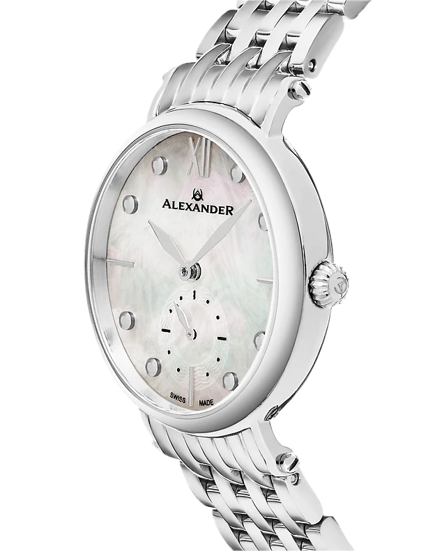 The Swiss Made Roxana A201B elegantly combines luxurious design with precision craftsmanship. This ladies’ watch features a 34mm stainless steel case and a stunning mother-of-pearl dial, exuding sophistication and style. The Ronda 1069 Swiss Quartz movement ensures accurate timekeeping, while the small-second subdial adds a unique touch. With an 8mm case thickness, this watch sits gracefully on the wrist. The stainless steel 7-segment link bracelet enhances the overall elegance, making it a perfect accessory for any occasion. Protected by a scratch-resistant sapphire crystal and water-resistant up to 5 ATM, this timepiece offers both beauty and durability.