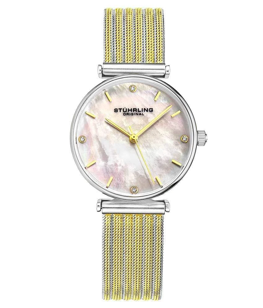 - Decadent looks meet effortless grace in the Cambria’s Mother of Pearl dial with four crystal markers.