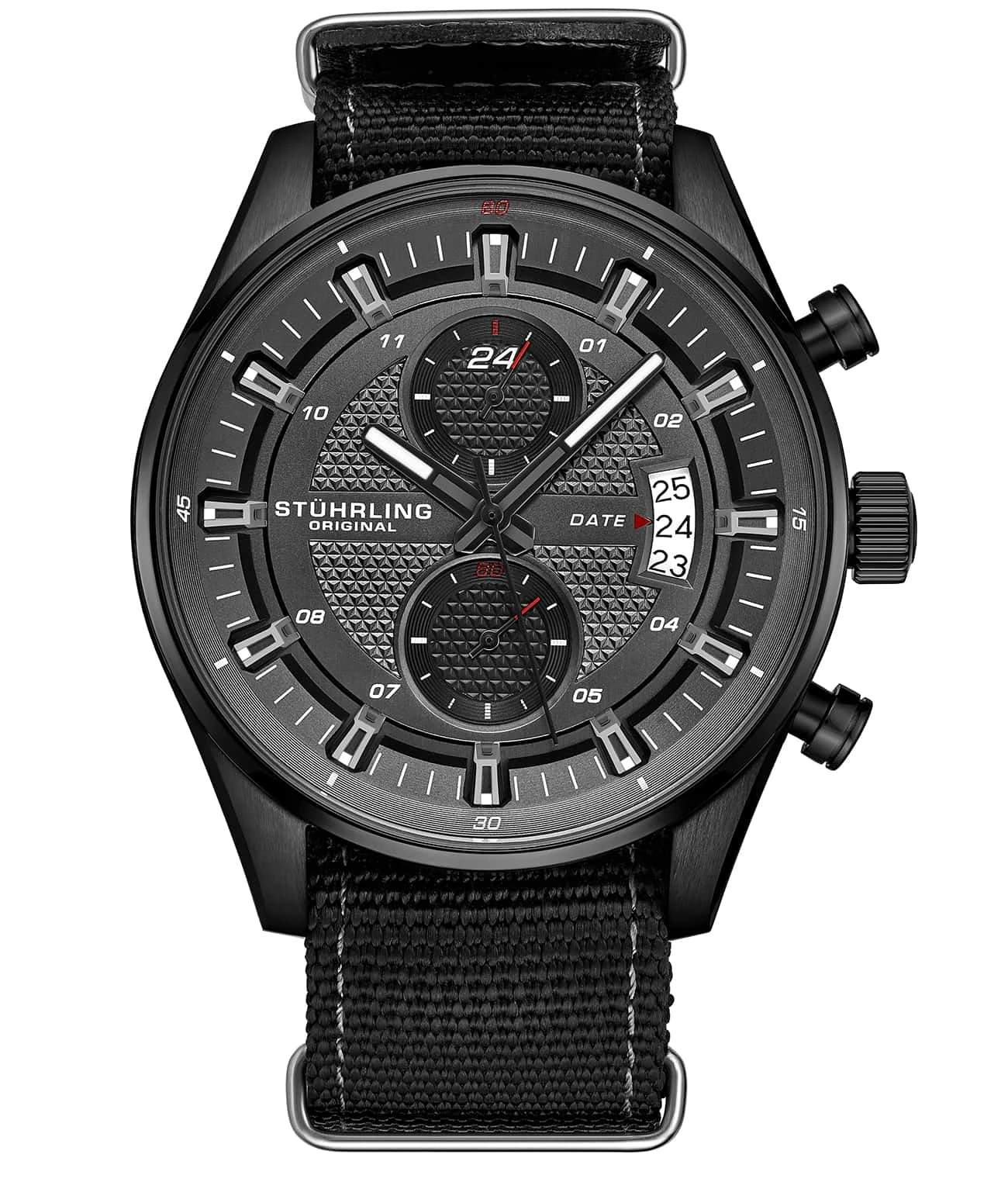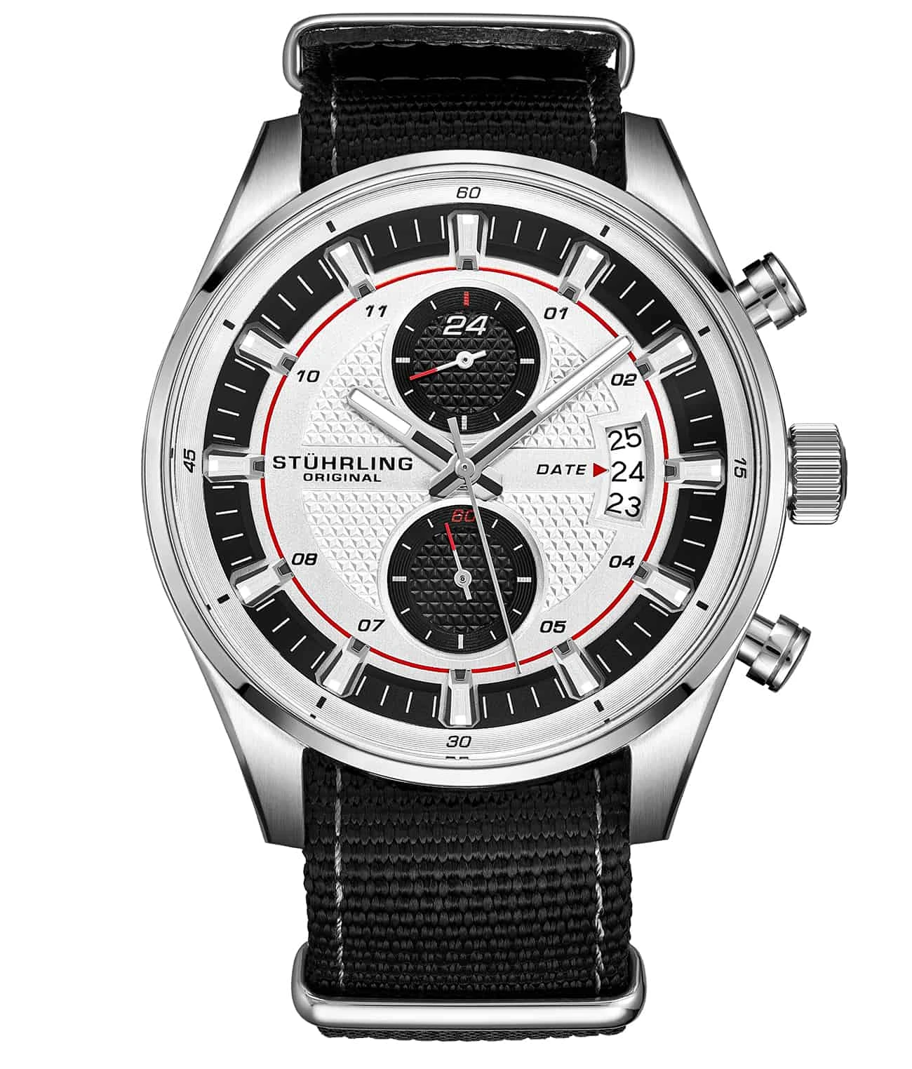 This watch captures the essence of a sophisticated timepiece with its sporty yet polished appearance. The 44mm case size strikes a balance between boldness and wearability, making it suitable for a range of occasions. A polished beveled bezel surrounds the intricately designed dial, which features a combination of sleek lines and functional subdials. The nylon strap adds a touch of casual style, while ensuring durability and comfort.