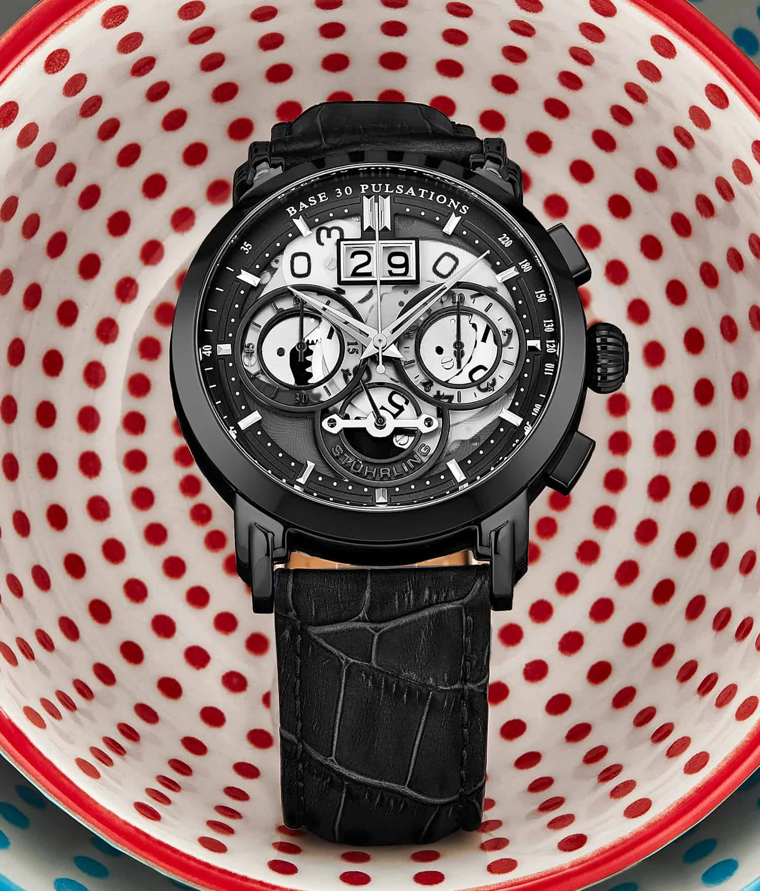Commanding doesn’t even begin to describe the all-encompassing presence of this exquisite Imperia Quartz Chronograph. Made to be shown off and fawned over all at once, this massive 47mm watch can keep ticking up to 50 meters/165 feet — not that you want to get that genuine embossed alligator leather band wet. With a face made of Krysterna scratch-proof glass, the Imperia Quartz is as tough on the outside as it is inside.Â