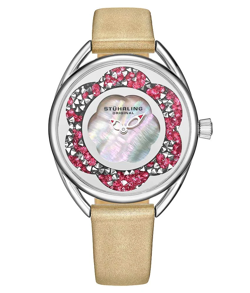 - Mother of Pearl inner dial is surrounded by a flower-pattern cutout filled with crystals, creating a one-of-a-kind display.