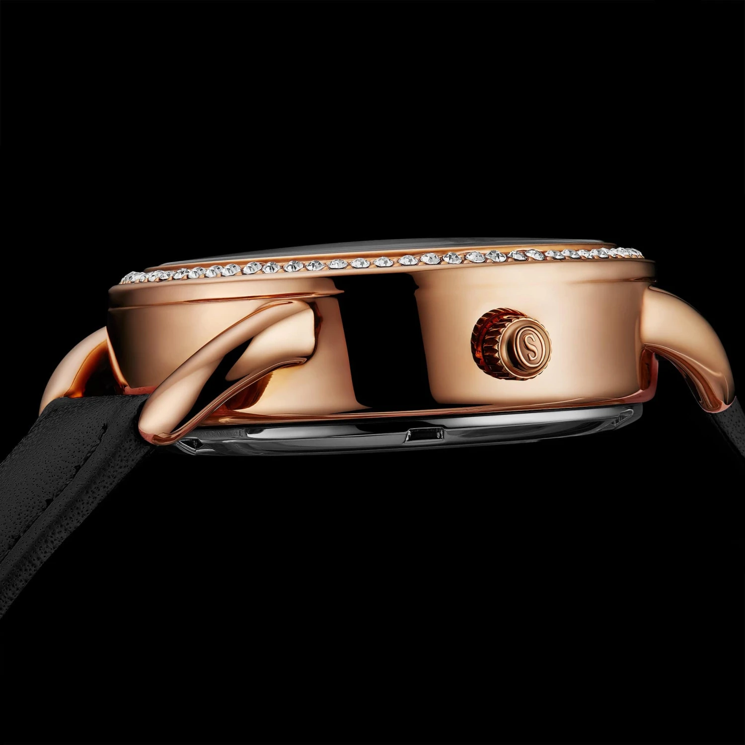 This elegant 36mm watch is designed for those who appreciate a blend of style and durability. It features a fixed crystal studded bezel that adds a touch of glamour, while the 5 ATM water resistance ensures practicality for everyday use and light water activities. The genuine leather strap, 16mm in width, offers a comfortable fit and a timeless look, making this watch perfect for various occasions.