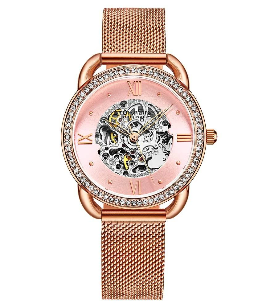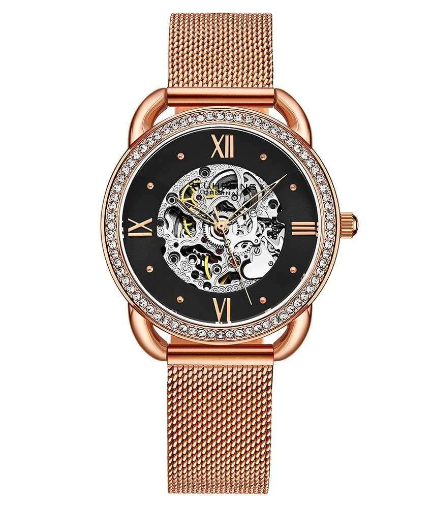 The Nexus is a testament to the beauty of watchmaking, blending timeless aesthetics with the allure of mechanical precision. This 36mm skeleton watch is not just a timekeeper; it is a piece of wearable art. Encased in a crystal-studded bezel that catches the light with every movement, the skeletal dial offers a window into the soul of the timepiece, revealing the intricate dance of its internal workings. Complementing the technical wonder is the mesh bracelet band, 16mm wide, that provides a modern twist on a classic design, offering both comfort and a distinctive look.
