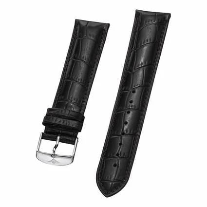 22 mm Black Leather Replacement Strap with a Steel Tang buckle. This is a direct replacement for Stuhrling model 118B.
