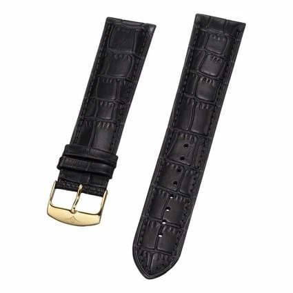 22 mm Black Leather Replacement Strap with a Yellow Gold Tang buckle. This is a direct replacement for Stuhrling model 293.