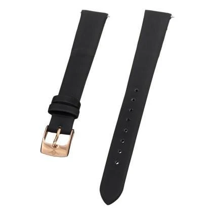 14 mm Black Leather Replacement Strap with a Rose Gold Tang buckle. This is a direct replacement for Stuhrling model 734LS2..