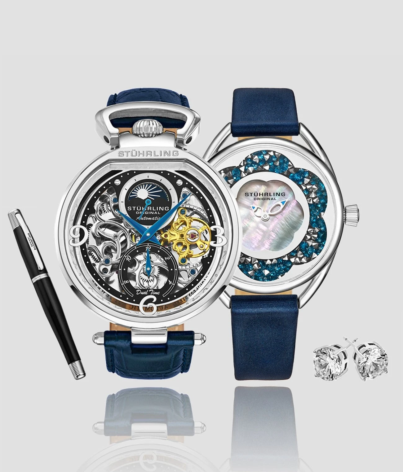 For the romantic couple, this set pairs a truly unique vintage-style skeleton watch with our sweet + classic Lily quartz for her. She’ll swoon for the mother of pearl dial detail.