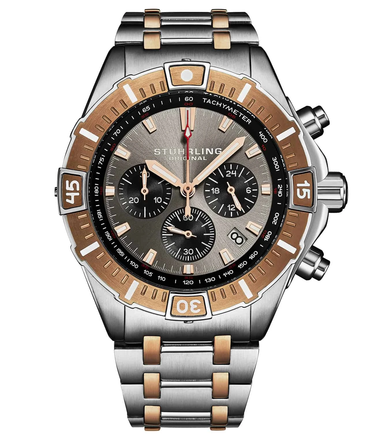 The Stuhrling Stellar 44mm Chronograph embodies precision and style, tailored for discerning individuals who seek excellence in every facet of life. With robust functionality seamlessly integrated into a sleek, modern design, this timepiece becomes the ideal companion for both professional pursuits and adventurous escapades.